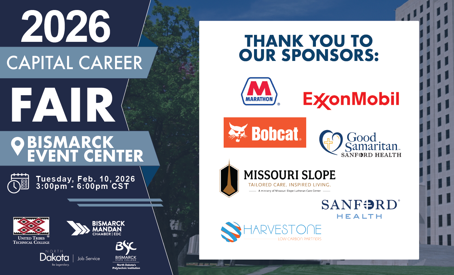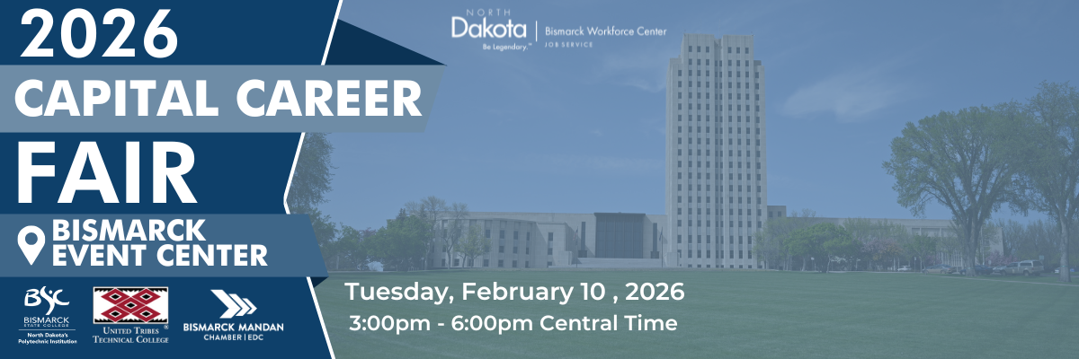 We're excited to announce that Job Service, Bismarck State College, and United Tribes Technical College will be hosting the THIRD ANNUAL Capital Career Fair on February 10, 2026 from 3-6pm!