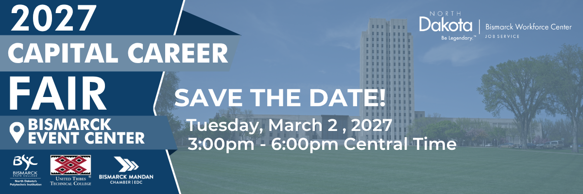 We're excited to announce that Job Service, Bismarck State College, and United Tribes Technical College will be hosting the FOURTH ANNUAL Capital Career Fair on