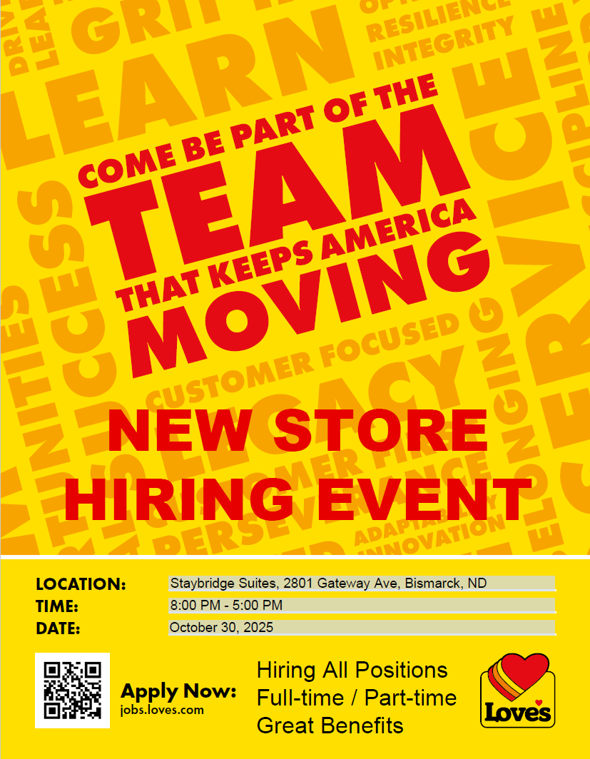 Love's is opening a new location in Sterling, ND! Come stop by their Hiring Event happening on October 30, 2025 from 8am- 5pm at the Staybridge Suites (2801 Gateway Ave. Bismarck, ND). Learn about the various positions they are hiring for as well as their great benefits! Walk-in Interviews available!